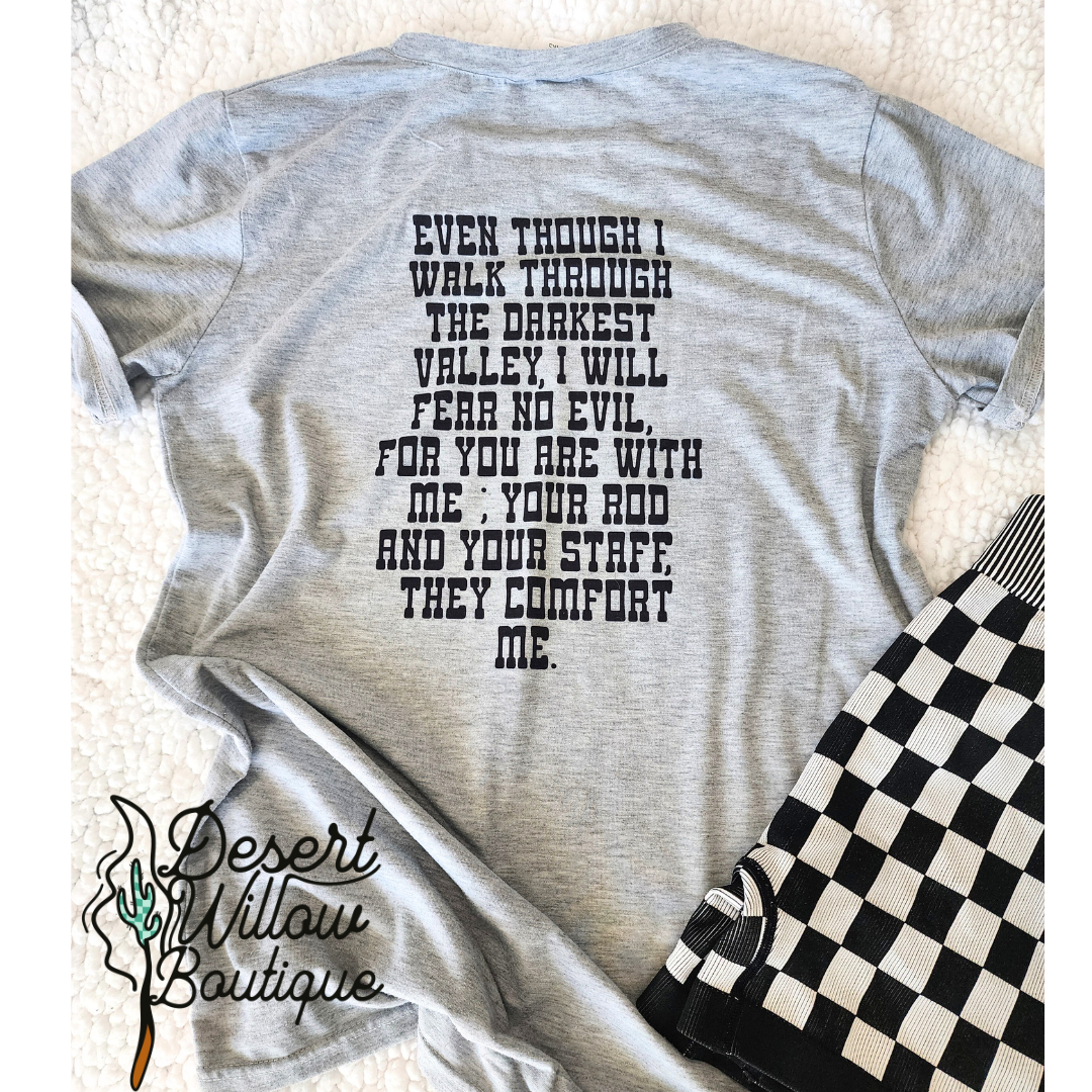 Fear no evil Though I walk through the darkest valley, I will fear no evil, for you are with me; Your rod and your staff, they comfort me.